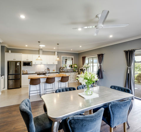 Nestled in a quiet cul-de-sac, this spacious five-bedroom, double-garage Horvath home is perfect for families seeking comfort and style. The master suite opens to a covered patio, creating a private retreat for relaxation. At the heart of the home is the entertainer's kitchen, featuring a five-burner gas hob, a generous walk-in pantry, and a seamless flow to the family room and outdoor living area.